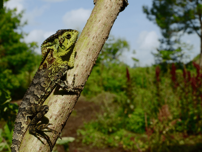 The keeled helmeted iguana (Corytophanes percarinatus) is a cloud forest specialist. We have found individuals basking at the edge between natural forest and an agroecology parcel growing crops such as amaranth, pineapple, and malanga. The wildlife friendly techniques of agroecology provide enough food and habitat structure for this amazing lizard to feel secure enough to bask in the morning sun.